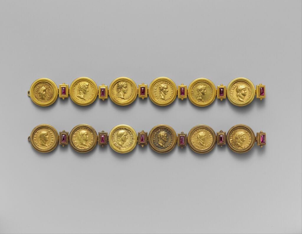 Sięgali po nią tak mężczyźni, jak i kobiety – powszechnie wyrabiane były brosze, kolczyki, które komunikowały lojalność wobec aktualnie panującego cesarza, ale i to, że posiadacz lub posiadaczka mają dostatecznie duży kapitał, aby nie musieć troszczyć się jedynie o podstawowe potrzeby i móc pozwolić sobie na estetyczny zbytek. A było w czym wybierać – to rzymskie złotnictwo wypracowało takie sposoby oprawy monet, aby nie uszkodzić wizerunku, nie zmniejszyć wartości kruszcu, a jednocześnie umożliwić np. podziwianie tak awersu, jak i rewersu. Przyznam szczerze, że rzymska estetyka bardzo do mnie przemawia.