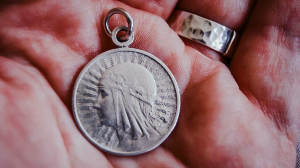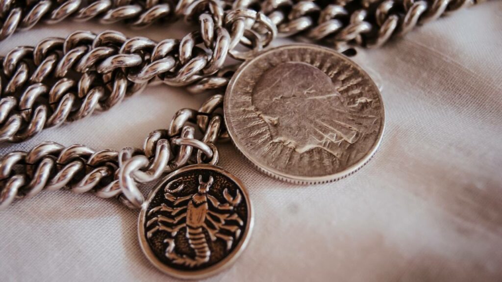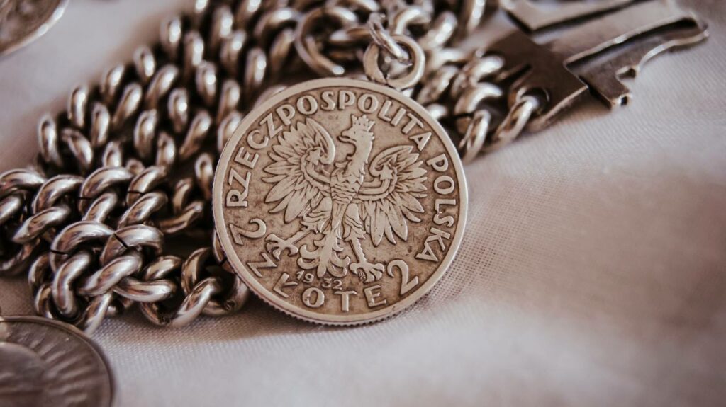 Pewnego dnia przy piwie z teściem rozmawialiśmy o mojej wielkiej miłości do masywnych bransoletek w formie pancernych łańcuchów. Mam do nich słabość, która przypomniała mu, że posiada w swoich zbiorach coś, co mogłoby te moje upodobania nieco podkarmić – i podarował mi bransoletę, do której doczepione są dwie zawieszki, jedna z zodiakalnym skorpionem, druga zaś – wykonana z polskiej srebrnej monety z wizerunkiem Polonii z międzywojnia.